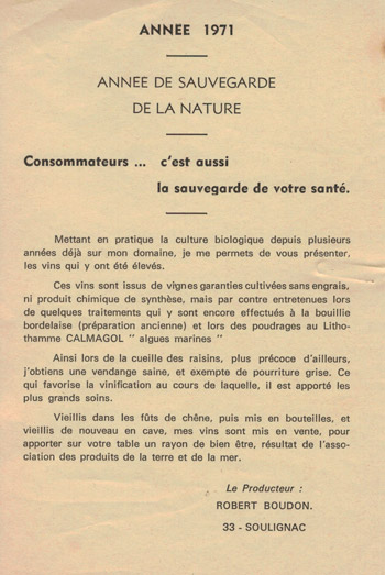 « C’est en 1963 que mon père reconvertit entièrement le vignoble familial à l’Agriculture biologique, renonçant alors à la course à la productivité et à l’utilisation de produits chimiques de synthèse dans les vignes. Cette orientation, très avant-gardiste pour l’époque, lui fut inspirée par une méthode d’agriculture biologique initiée par Raoul Lemaire. Mon père avait en effet la certitude que le mode de production intensif et ses pratiques polluantes allaient dégrader l’expression de nos terroirs, et auraient de graves conséquences, tels : la disparition progressive de certaines espèces animales et végétales, et la pression des ravageurs causée par le déséquilibre des écosystèmes.
