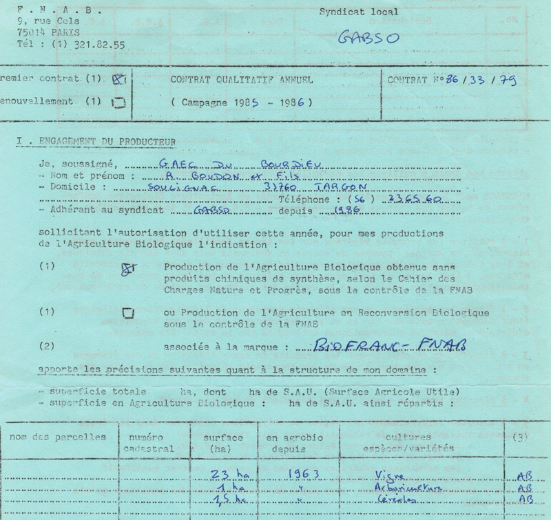 Cette certification, basée sur le cahier des charges de Nature & Progrès, fait l’objet d’un contrôle annuel. En 1987, 283 propriétés agricoles en bénéficient. La Fédération Nationale de l’Agriculture Biologique (FNAB) est créée en 1978 par des agriculteurs biologiques, pour porter une voix spécifique à la profession et devenir l’interlocuteur privilégié des pouvoirs publics lors des négociations. Il défend l’ensemble des agrobiologistes du territoire, indépendamment de leur appartenance à une marque (au nombre de 16 à cette époque). C’est à cette période que le label AB apparaît sur nos étiquettes.
