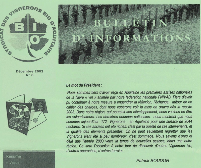 Aujourd’hui Vignerons Bio Nouvelle-Aquitaine, cette association assure la représentation et la défense des intérêts des vignerons auprès des institutions régionales, nationales et européennes. Elle a également pour mission de structurer la filière des vins bio en amont comme en aval (études statistiques, diffusion d’informations, formation des vignerons et appui à la vinification). Elle assure aussi un rôle de promoteur auprès des professionnels et des particuliers en organisant divers événements nationaux et européens.