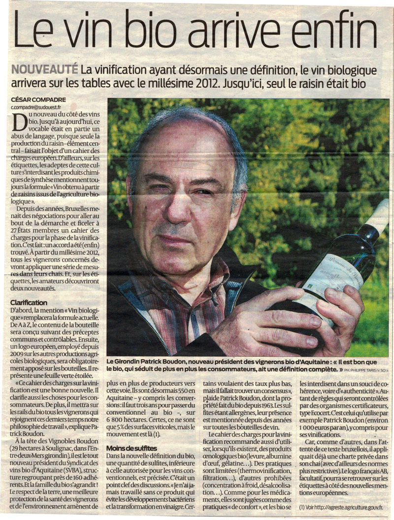 Vignerons Bio Nouvelle-Aquitaine et ses équivalents dans les autres régions (sous l’égide de la FNIVAB, aujourd’hui France Vin Bio) établissent une charte œnologie pour que la vinification respecte aussi les principes de l’agriculture biologique. Présentée au Ministère de l’Agriculture, elle devient officielle seulement en 2012 lorsqu’elle est reconnue par le ministère et l’Europe.
